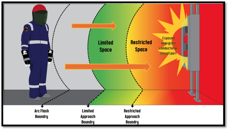The restricted approach boundary is the distance from an exposed part which is considered the same as making contact with the live part. Only qualified personnel wearing appropriate personal protective equipment (PPE), having specified training to work on energized conductors or components, and a documented plan justifying the need to perform this work may cross the boundary and enter the Restricted Space. Insulated gloves, tools, and equipment are required within this boundary.